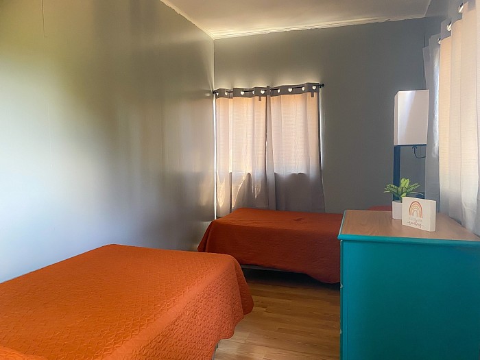 Palm tree decor in 2 bedroom cabin with 1 full & 1 queen size bed in front bedroom and 2 twin size beds in back bedroom plus a futon in the large living area. This is our largest 2 bedroom cabin. View of the lake from kitchen and back bedroom.