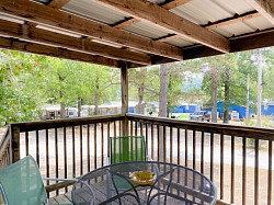a studio style large One bedroom cabin that has 2 queen beds & a sleeper sofa in the open bedroom area. Dining area with a beautiful view of the lake.